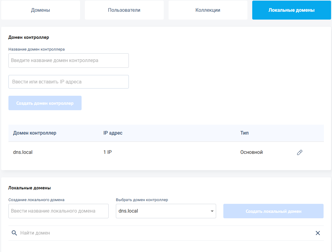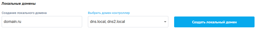 Для добавления записи локального домена, в блоке Локальные домены укажите имя домена и от какого из созданных домен контроллеров он будет резолвиться. После нажмите Создать локальный домен.