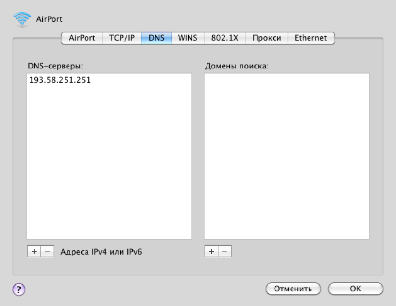 - В открывшемся всплывающем окне выберите вкладку "DNS", добавьте наш DNS-сервер: 193.58.251.251 и нажмите кнопку "OK".