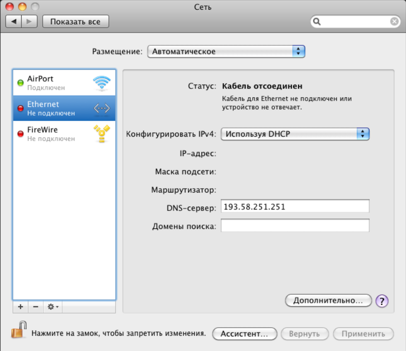 - В случае, если вы пользуетесь подключением по Ethernet, выберите соответствующий пункт меню и в строке "DNS-сервер" добавьте наш DNS-сервер: 193.58.251.251.