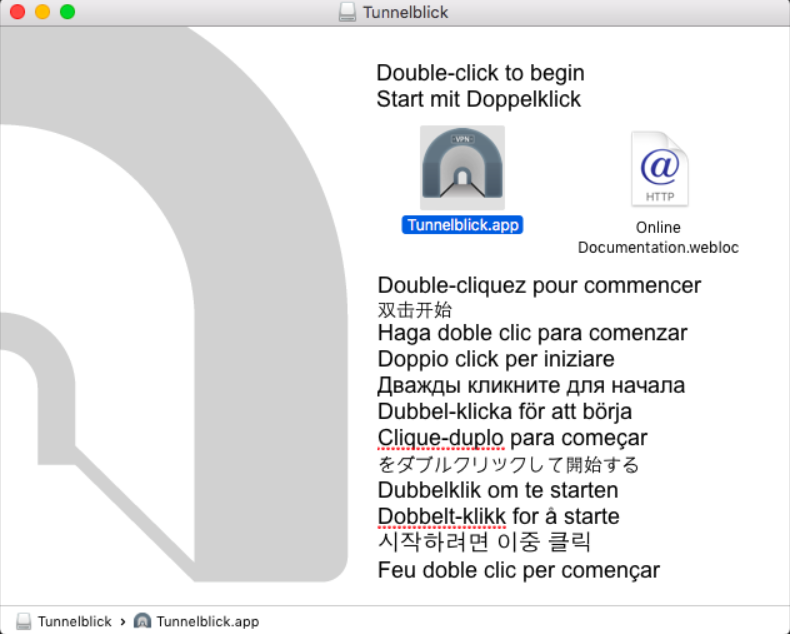 - Открыть скачанный образ и двойным кликом открываем приложение Tunnelblick.app: